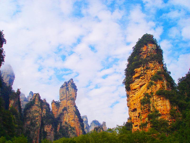 天門山國家森林公園四面絕壁,雄偉壯麗。保存著完整的原始次生林,植物資源豐富,有世界罕見的高山珙桐群落。天門山文化底蘊(yùn)深厚,留有大量贊詠天門山的詩詞,更有眾多神聞傳說,被譽(yù)為“張家界之魂”。山頂天門山寺自唐朝建成以來香火鼎盛,寺外有七級浮屠,掩映于青枝綠葉中,古雅幽清。善男信女入寺拜佛,撞鐘響徹天際,擊鼓震動山岳,香煙裊裊如云。明萬歷年間南岳僧在此傳經(jīng)授戒,從此聞名遐邇,朝山拜佛者達(dá)周邊四郡十余縣,信士遍及湘西北,天門山因此成為 “湘西第一神山”。天門山終年云霧繚繞,云海景象變化無窮。山間溶丘、石芽廣布,奇石秀木及珍禽異獸繁多,更有飛瀑流泉噴涌而出。天門山兼峰、石、泉、溪、云、林于一體,集雄、奇、秀、險(xiǎn)、幽于一身,被譽(yù)為空中原始花園。天門洞、天縫渡仙、五指山、將軍石等是有名的峰林景觀,還有神秘的千佛洞等待你的探奇;山間的韓家溝則是富蘊(yùn)滿族風(fēng)情的村落——這里久居的幾十戶滿族農(nóng)家至今仍完好保留著其在語言、飲食、衣著、居住以及婚慶殯葬等方面的滿族風(fēng)俗,是難得的民俗文化旅游地。