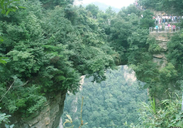 在砂刀溝盡頭右側(cè),袁家界左面南沿,一天然石橋凌空飛駕于兩座巨大的石峰之巔,厚約4米,寬2米余,跨度約50米,相對(duì)高度400多米。橋面兩端石峰上,綠樹叢簇,郁郁蔥蔥,峰壁則宛若斧劈,草木不生。立橋邊俯視,透過稀疏樹葉,見云涌霧蒸,幽深莫測(cè)。自北端步行過橋,狹窄處僅數(shù)十厘米,心驚卻步。繞過深谷,站在相距40多米處觀橋臺(tái)上,橋的全貌映入眼簾,橋身雄奇?zhèn)グ丁?