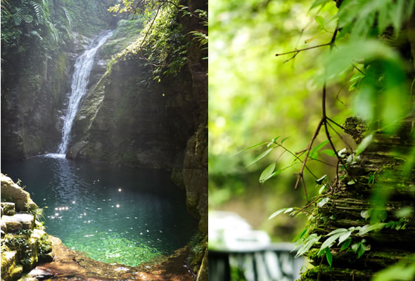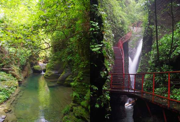 十八潭總名。稍作休憩,我們開始奔赴東線的景點。東線主要是以十八潭為主,下游有4潭:合潭、梳妝潭、魚潭、黑潭;中游有9潭:換衣潭、美人潭、石蛙潭、姊妹潭(3個)、情侶潭(2個)、二龍搶珠,上游有5潭:鬼谷神功(2個)、幽潭、落銀潭(彩虹潭)、路邊潭。十八個潭深淺不一,淺則1米以上,深則4米左右,形狀各異,有的月牙形,有的豬腰狀,形狀不規(guī)則,石壁上水沖成潭,真是鬼谷神功,此處水質細膩,加之綠林映襯,水色碧綠見底,猶如十八顆翡翠石鑲嵌在山林之間,涓涓溪流晶瑩剔透,飛流直下的瀑布,氣勢磅礴,蔚為壯觀, 下游的4潭,合潭、梳妝潭、魚潭、黑潭。合潭是仙女峽谷與十八潭的交匯處;梳妝潭的水清如明鏡,又因為潭兩側石頭的封閉,使這面鏡子靜止不動,很方便梳妝,照鏡子。在梳妝潭周圍,有一種植物屬于紅豆杉系列,它的形狀好似梳子,可以用來梳頭。魚潭可不能望文生義。魚潭,是在冬天的時候,所有的魚都聚集在這里過冬,除此之外,這個潭水淺見底,冬天魚苗聚集,是捕魚的好季節(jié)。黑潭,水深不見底,所以叫黑潭,F(xiàn)在已經(jīng)看不見梳妝潭、魚潭、黑潭了,你猜為什么?建水庫,建水上樂園,淹沒了。 斷魂石的傳說。三國時期,高氏和蕭氏一對夫妻春節(jié)忙活,遇上了天門垮眼,受余震襲擊,打死了丈夫蕭氏。高氏思念丈夫,淚哭不斷,結果摔死潭中。人們經(jīng)常還能聽到哭聲傳來,不敢單獨行走,需成群結隊。后人為了鎮(zhèn)邪,雕刻一條蜈蚣驅趕哭魂,多年后,蜈蚣成精,天上打雷,巖石發(fā)光,遭雷所劈,成了斷魂石。 和尚姥,也就是丹灶峰,天門十六峰之一。相傳此峰為仙人化身,赤松子曾在此煉丹,許多詩人在此留下了美妙的詩篇,明代葉守禮《丹灶峰》: 懸崖峭壁隔塵寰,上有仙人學煉丹。 煉得丹成鶴已去,獨留丹灶在峰巒。 意思是說,在這險峻秀麗的山峰上,赤松子潛心煉丹,不受塵世干擾,身心沉醉于秀美的山間,沉溺于丹藥的煉制之中。作者很是羨慕那種與世隔絕的超脫,那種執(zhí)著于自我理想的瀟灑,你羨慕不羨慕? 竹林叢生。我們要學習竹子的精神,中空、謙卑;我們要學習竹子的精神,抱團生長;我們要學習竹子的精神,破土而出,節(jié)節(jié)高。 向家塔。打造農耕養(yǎng)生游的地方。種田、種菜、種花,農家餐館。 爛泥巴根。爛泥巴根和馬桑樹是同科,是這里獨特的一種樹。馬桑樹亦稱“千年紅”、“馬鞍子”,屬落葉灌木,馬桑樹多枝叢生,一簇一簇的,枝葉像傘蓋,因此“馬桑樹兒搭燈臺”。春風一吹,滿山的馬桑樹、爛泥巴根就吐翠滴綠,顯示出強勁的生命力。打油詩一首: 青青枝條四方走, 肥肥大葉落上頭, 身在路邊無人問, 冬去春來樂悠悠。 秋天死亡,春天長勢更加茂盛,它的新生是通過死亡實現(xiàn)的。山川如此,植物也是如此,這里的一草一木無不透露著道家那種齊生死、等貴賤的精神。 這叫“常道”亭,“道可道,非常道”,據(jù)說是白狐與劉海相遇的地方。吊橋。 十八潭各具特色。 中游有9潭。第五潭叫換衣潭。巖石聳立,霧氣氤氳,巖壁上布滿水汽,猶如雨下。又因過道狹窄,行人需彎腰通過,未免雨水打濕衣裳,在此就要脫下身上衣物,通過后在第六潭再穿上。因此第六潭又叫美人潭,很幽深神秘的。第七潭叫石蛙潭,水淺,又比較平穩(wěn)、安全,春天產籽。余音回響,猶如蛙鳴,給人“聽取蛙聲一片”的錯覺。 對面巖壁叫“臘肉鋪”,那條自上而下的溪流叫“酒長流”,客人來了,咱土家人熱情,臘肉下炕,苞谷燒,喝兩口! 第八潭第九潭叫情侶潭,比較隱蔽,他倆靜悄悄地談著情話,我們快走,不要打攪他們。 第十潭、十一潭、十二潭叫姊妹潭。下面那個,水淺淺的,溫溫的,是幺妹潭,中間那個是二哥潭,上面那個是大哥潭。 潭的旁邊有珍稀植物馬蘭花,馬蘭花又名蝴蝶花、蝴蝶蘭,為多年生宿根草本花卉,根莖短粗,肥壯;ù笮缕,花色絢麗,鮮艷奪目。花有藍、白、黃、雪青等色;ㄆ5-6個月,每次花可開花7-10天,頗耐觀賞。馬蘭花在我國栽培已有2000多年的歷史,目前歐、亞、非3洲均有分布,品種極多,難以計數(shù)。此花按植株高度不同可分3種類型:矮株型僅18-25厘米,中株型高25-70厘米,高株型可高達120厘米。馬蘭花喜陽光,適栽于背風向砂質土壤中。 馬蘭開花的童謠。他們三姊妹小時候情感深厚,常常一起跳皮筋。大家會跳嗎?會唱嗎? 小汽車,滴滴滴,馬蘭開花二十一, 二五六二五七,二八二九三十一, 三五六三五七,三八三九四十一, 四五六四五七,四八四九五十一, 五五六五五七,五八五九六十一 ! 還有紅豆杉,像梳頭的篦子,叫“篦子三尖杉”。還有蘭心草,中草藥,空中飄來蘭花的香氣,山谷中峭壁的蘭花,如芳芳人品善良高雅。蘭花如人品有宜人的香氣,蘭花有撩人的幽香,任何花卉的香氣都不能與蘭花比。這幽香時隱時現(xiàn),時濃時淡,時遠時近。飄蕩在老道灣山谷中,給人清新和愉快的感受。 蘇轍有詩:“谷深不見蘭生處,追逐微風偶得之”。 還有大葉榕、玉葉金花、秋海棠、臘蓮繡球、四字馬蘭、紅楓,秋天來臨,看!漫山紅遍,層林盡染。 聞道亭。孔子曰:朝聞道,夕死可以。意思是說,人生悟到“道”的真諦是多么重要,如果是早上知道的,哪怕晚上去死都是值得的。 第十三潭叫二龍搶珠。兩條瀑布傾瀉而下,在中間交匯,就像是二條龍爭搶寶珠一樣。結果,這寶珠被狐王拿到,狐王又送給白狐當定情物,哪知白狐遇見善良的劉海,于是,