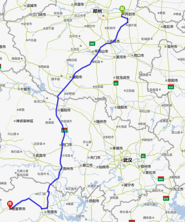 開(kāi)封去張家界自駕車(chē)自助游線路圖全程高速):