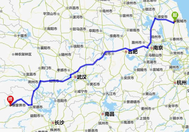 左右,沿途經過鹽城——淮安市——揚州市——滁州市——合肥——六安市——麻城市——仙桃市——潛江市——荊州市——常德市(這里可以不走常德,直接從荊州經澧縣、石門縣到慈利縣)——慈利縣——張家界。